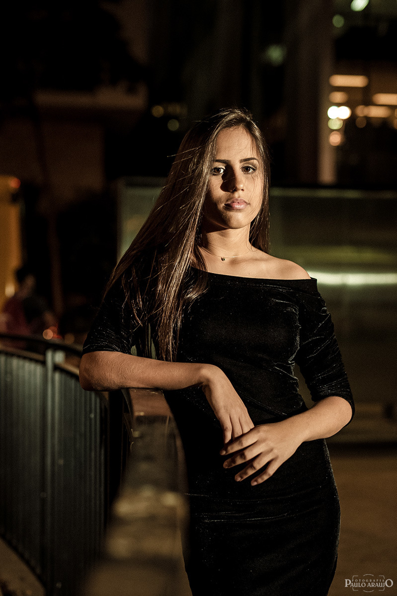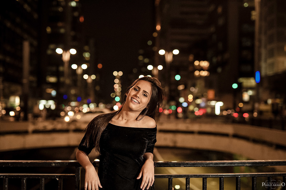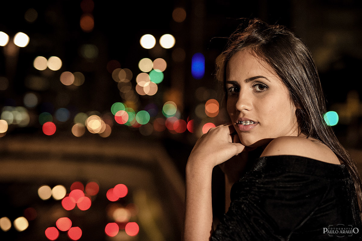 Quando anoiteceu fizemos algumas fotos aproveitando as luzes de farol dos carros que passavam, fazendo aquele fundo de bolinhas coloridas, que na fotografia chamamos de efeito bokeh.